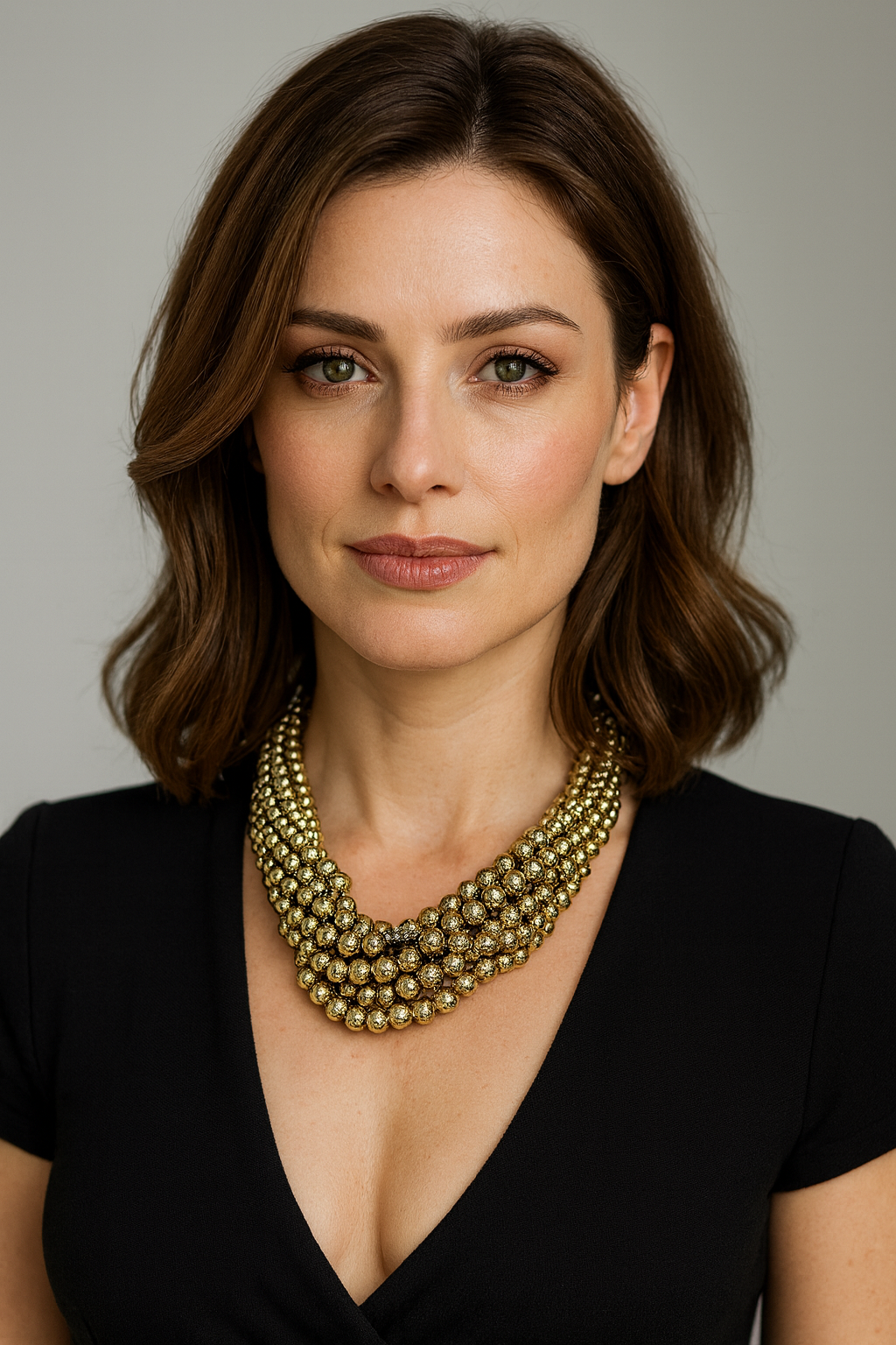 Questa collana è composta da più fili di perle metalliche lavorate, disposte con eleganza per creare un effetto scenografico ma armonioso.
