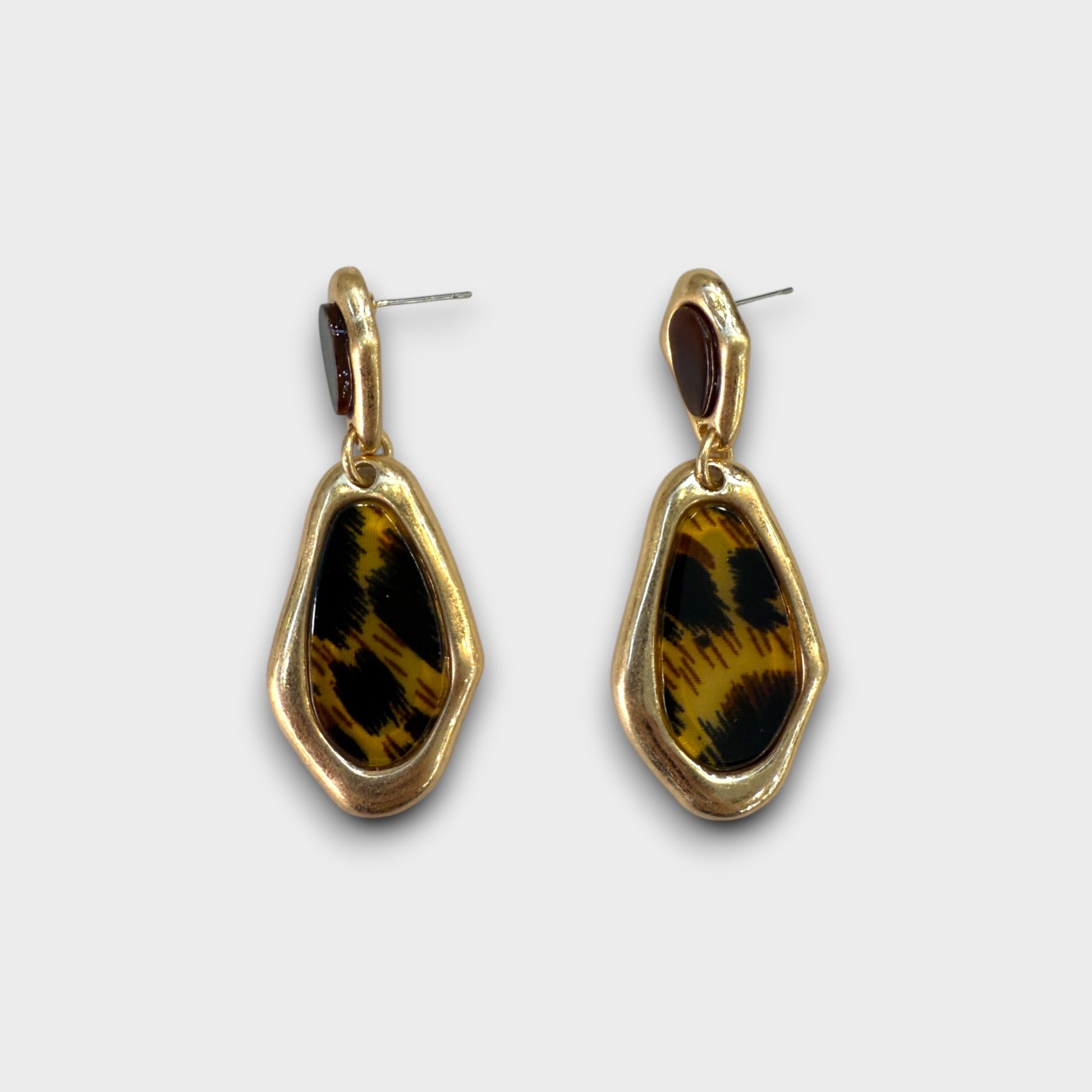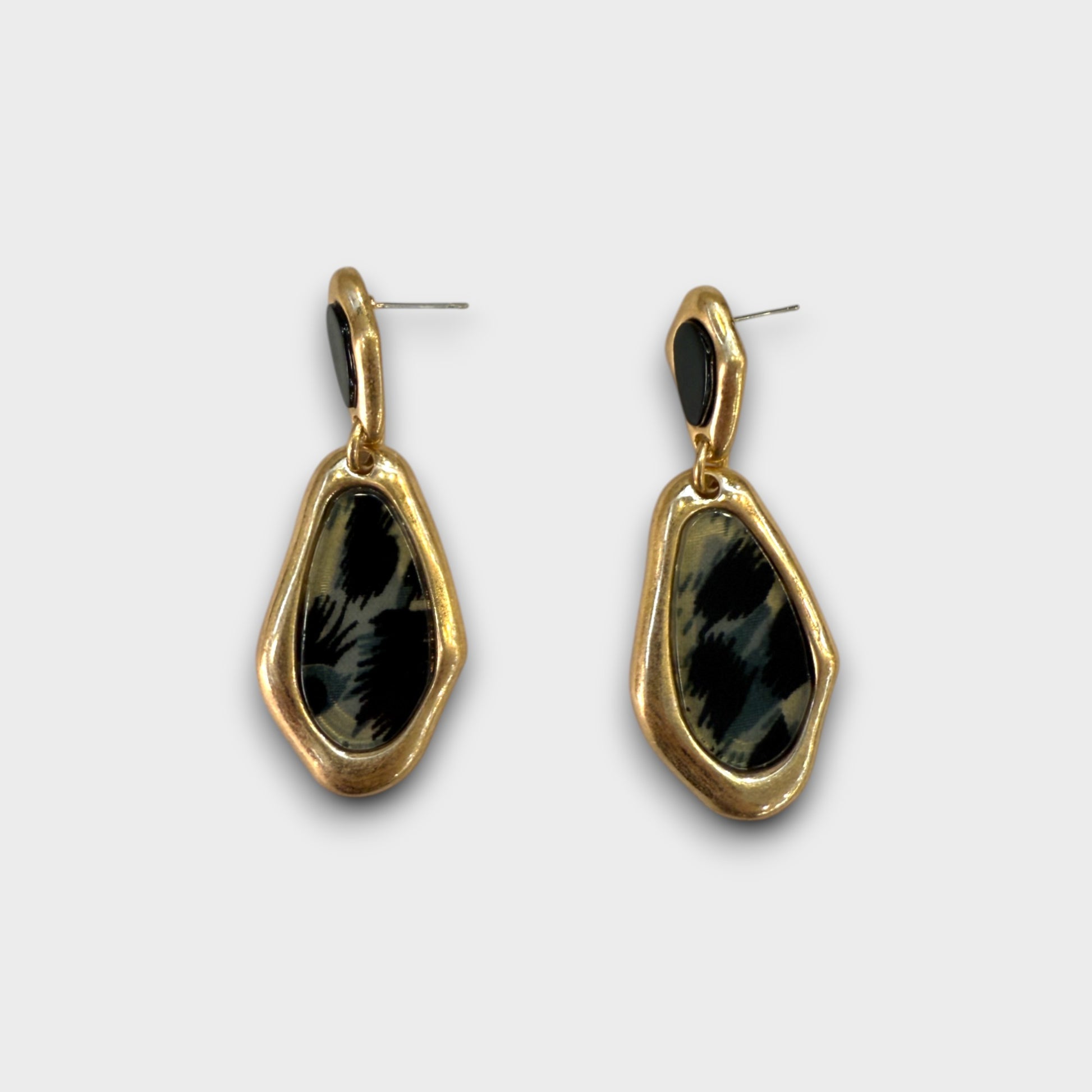 Questi orecchini pendenti combinano la brillantezza del metallo dorato con la resina effetto maculato in forme irregolari, creando un look moderno e deciso.
